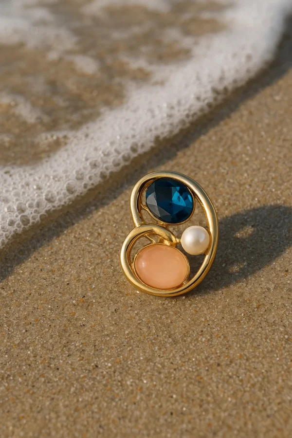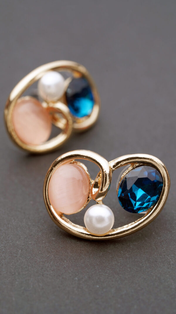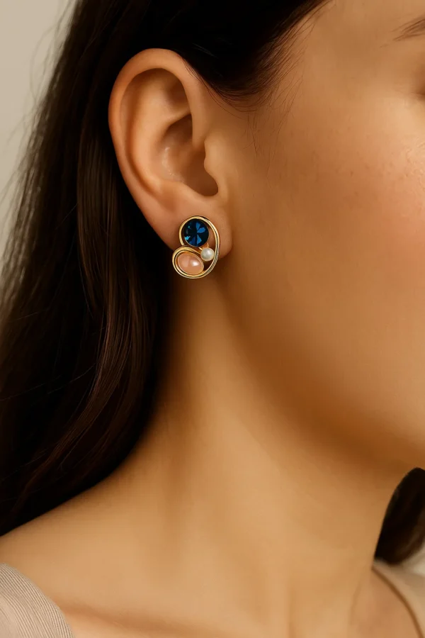 Dreamy, cosmic, and full of wonder — Celestial Curl Earrings look like a tiny piece of the universe crafted into jewellery. A swirling golden curl cradles a trio of elements: a soft rosy moon-stone, a deep midnight blue crystal that sparkles like a distant galaxy, and a pearl glowing like a tiny star. Together, they create a composition that feels mystical, radiant and beautifully balanced.
