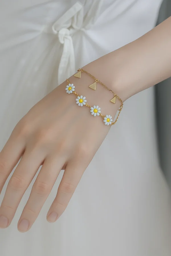 Fresh, youthful, and effortlessly charming — Daisy Daydream brings the warmth of spring to your wrist. Tiny white daisies 🌼 bloom delicately along the gold-toned chain, creating a look that feels like sunlight, softness, and carefree daydreams. Paired with minimal golden triangle charms, this bracelet captures the joy of slow mornings, gentle breezes, and moments that feel like poetry.