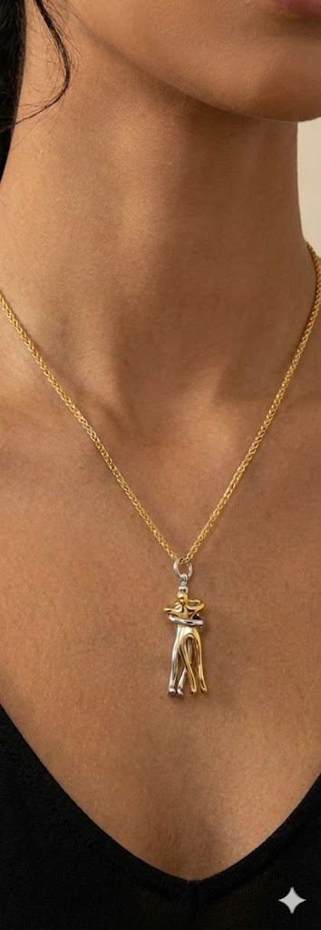 More than jewellery, this piece is an emotion you can wear. The Hold Me Forever Pendant captures the warmth of connection — two figures intertwined in an eternal embrace, one in gold and the other in silver, representing balance, unity, and soulful attachment. It’s a quiet reminder of love that chooses, stays, and stands strong through time.