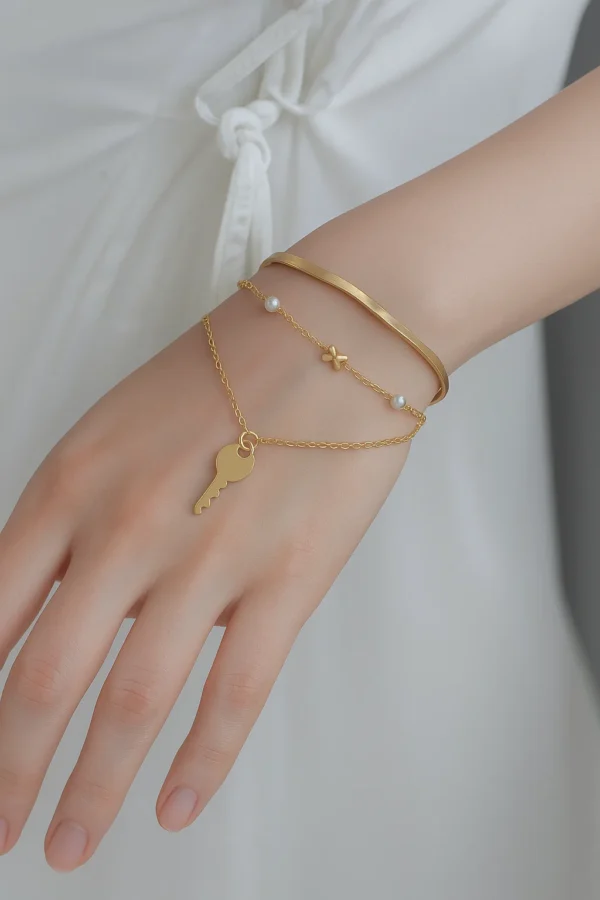 Delicate, meaningful, and effortlessly elegant — Key To My Heart Bracelet is a piece that carries emotion in its design. A fine gold-toned chain rests softly on the wrist, highlighted by a tiny key charm that represents love, trust, and the beautiful act of unlocking someone’s heart. Small pearl accents add a gentle glow, while the sleek gold bangle beside it completes the look with a touch of modern grace.