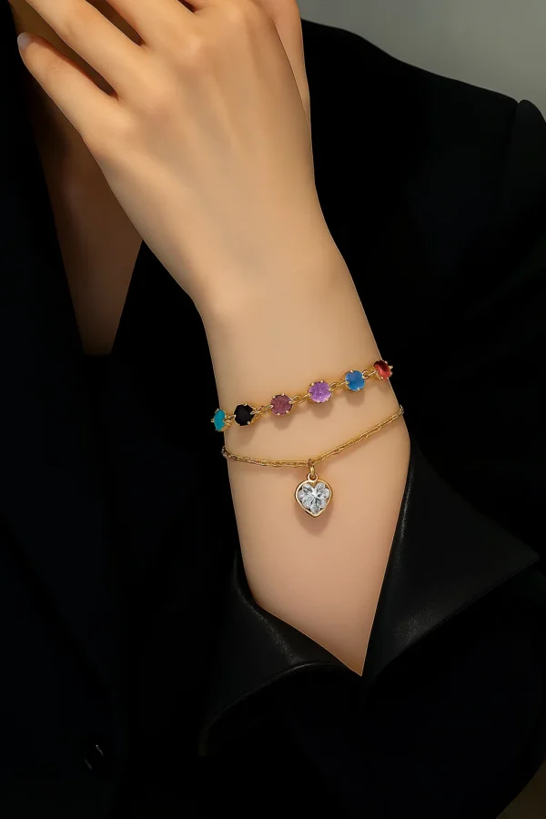 Meet the bracelet that does not believe in blending in — Luxe Prism is here to shine in every shade. 🌈 With multicolour gemstones lined up like little sparks of happiness and a dainty gold chain hugging a crystal heart charm, this piece brings joy, confidence, and a whole lot of personality to your wrist.