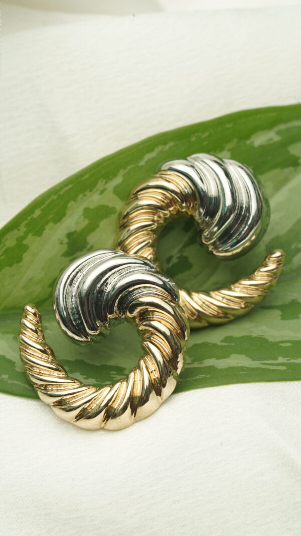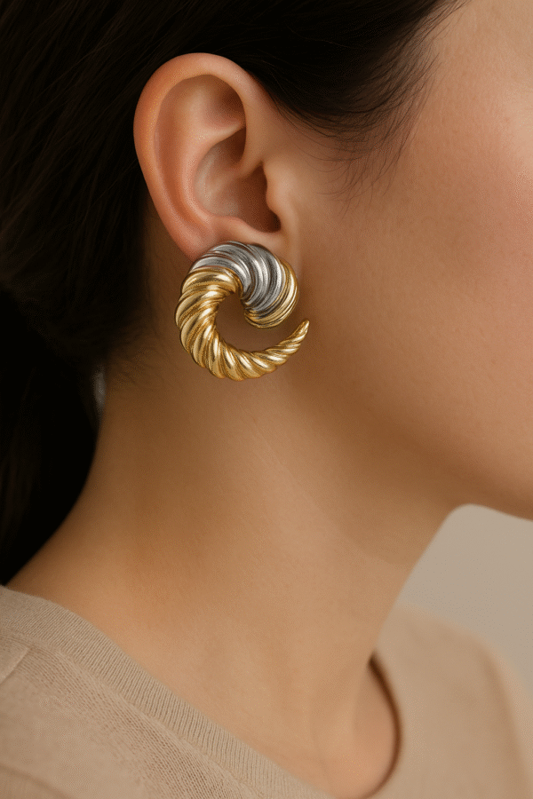 Artful, modern, and effortlessly glamorous — Twist of Elegance Earrings feature a dual-tone spiral design that curves like liquid metal in motion. The blend of gold and silver adds instant sophistication, making this piece a go-to for days you want to look polished without even trying.