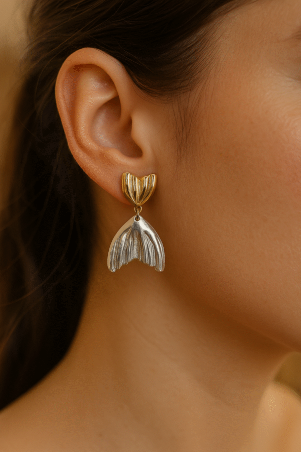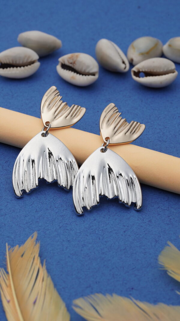As graceful as waves and as soft as sea breeze — Whispers of the Tide captures the spirit of the ocean in every curve. These earrings flow like silver tides against warm golden sands, with their double-toned, fluid shape resembling rippling water and swaying fins beneath sunlit waves. A little bold, a little wild — just like the sea.