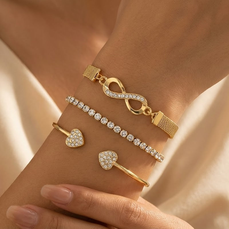 This beautifully curated stack features a delicate heart accent, a shimmering crystal line, and an infinity-inspired charm, coming together in perfect harmony for a layered look that feels both soft and luxe.